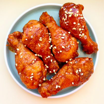 Нежные куриные крылья в хрустящей панировке, политые соусом, в котором переплетаются острота чеснока, жгучесть перца чили и нежность мёда. Украшается чесночными ломтиками.